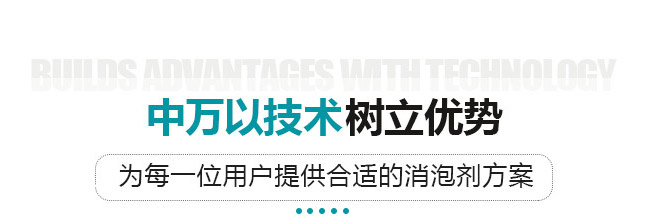 中萬是一家以解決各行業(yè)泡沫難題為使命的企業(yè),專注于各行業(yè)不同工藝的泡沫應(yīng)用研究,擁有8大體系成分產(chǎn)品,近2000個不同行業(yè)、不同細(xì)分領(lǐng)域工藝的成功應(yīng)用經(jīng)驗與解決方案,為您的生產(chǎn)工藝保駕護(hù)航。中萬在化工泡沫領(lǐng)域扮演著重要的角色,從嚴(yán)謹(jǐn)?shù)倪x料到獨特的應(yīng)用方案,推動著整個消泡劑行業(yè)的優(yōu)化升級,中萬因領(lǐng)先而備受推崇,用技術(shù)成就高效,提方案帶來卓越,讓服務(wù)適應(yīng)市場,中萬在消泡劑精益求精的道路上不斷地為客戶謀發(fā)展而開拓創(chuàng)造。